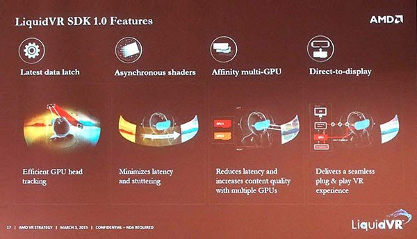 Η εικονική πραγματικότητα είναι το καυτό θέμα στο φετινό GDC 2015, καθώς οι περισσότερες εταιρείες έχουν στην ατζέντα τους κάποιο προϊόν ή κάποια πλατφόρμα προς παρουσίαση. Τώρα είναι η σειρά της AMD να αποκαλύψει το Liquid VR, ουσιαστικά μια πλατφόρμα ανάπτυξης υλικού (SDK) για συσκευές εικονικής πραγματικότητας που θα εκμηδενίσει τις καθυστερήσεις επειδή το 3D rendering θα γίνεται αυτόματα και σε πραγματικό χρόνο στην εκάστοτε συσκευή.