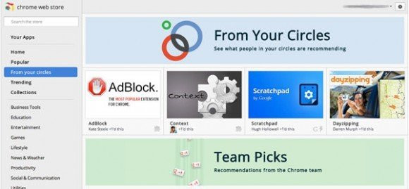 Στο εξής στο ηλεκτρονικό κατάστημα εφαρμογών του Google Chrome, θα μπορείτε να βλέπετε όχι μόνο δημοφιλείς ή ανερχόμενες εφαρμογές αλλά και τις προτάσεις των φίλων σας στο Google+ μέσα από τη νέα κατηγορία 'From your Circles'. Ακόμα όμως και υπόλοιπες κατηγορίες, κάθε τέτοια εφαρμογή δε θα εμφανίζει των αριθμό των downloads αλλά τους χρήστες που την επεσήμαναν με +1.