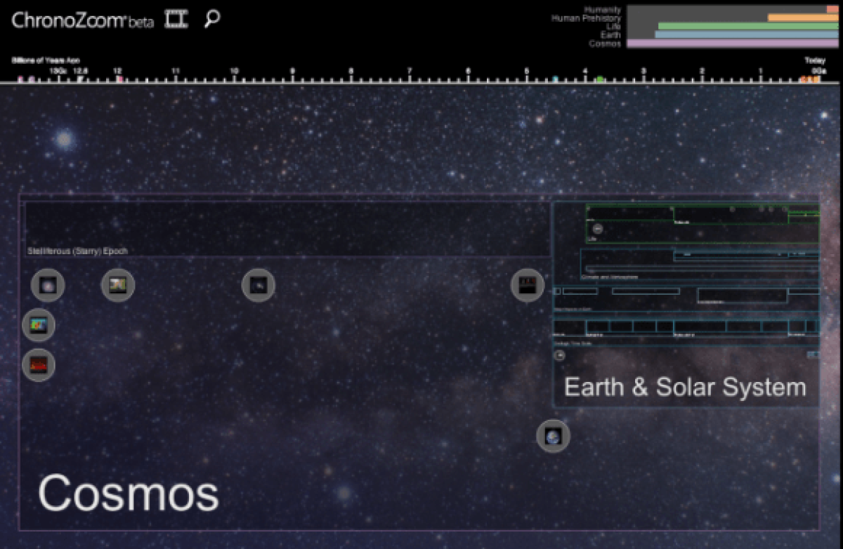 Το ChronoZoom είναι ένα πολύ ενδιαφέρον project που φιλοδοξεί να απεικονίσει την ιστορία των πάντων (βιολογία, φυσική ιστορία) από την αρχή του χρόνου και του Σύμπαντος μέχρι σήμερα, προϊόν συνεργασίας του τομέα Microsoft Research και των Πανεπιστημίων Berkeley και Moscow.