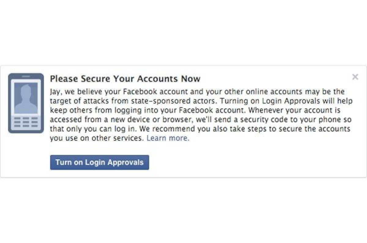 Συγκεκριμένα, το κοινωνικό δίκτυο θα στέλνει το μήνυμα που βλέπετε παραπάνω στην περίπτωση που υπάρχει υποψία για παραβίαση ή απόπειρα παραβίασης του λογαριασμού από κυβερνητικό οργανισμό ή άλλο χρήστη.