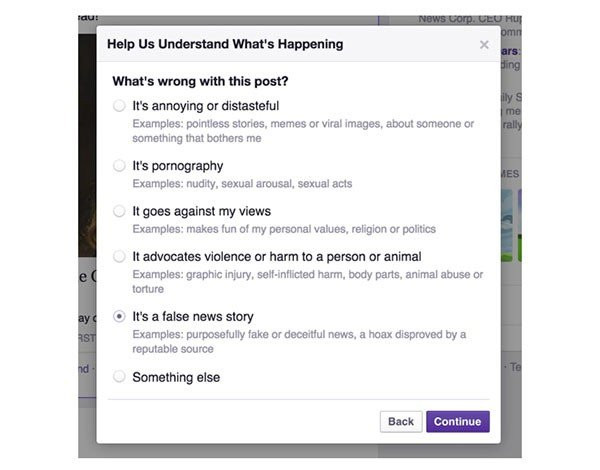 Σε μια προσπάθεια να καταπολεμήσει τις παραπλανητικές ειδήσεις και τις απάτες, η Facebook αποφάσισε να δώσει στους χρήστες την δυνατότητα να αναφέρουν ότι πρόκειται για λανθασμένη είδηση από τις επιλογές που εμφανίζονται σε κάθε post επάνω δεξιά.