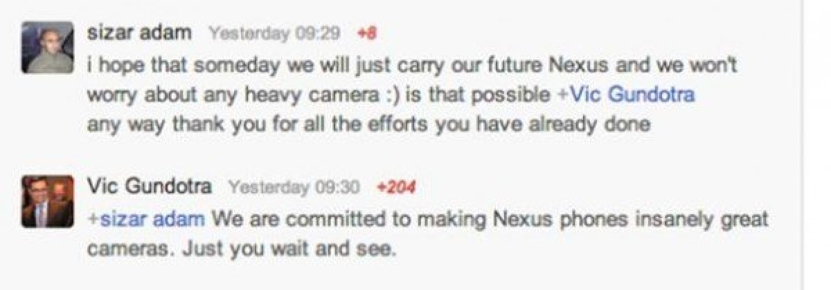 Για ακόμα μία φορά ο Vic Gundotra, αντιπρόεδρος Engineering της Google, προβαίνει σε αποκαλύψεις μέσα από το κοινωνικό δίκτυο Google+, καθώς ανέφερε ότι τα μελλοντικά Nexus smartphones θα μας αφήσουν με ανοικτό το στόμα για τις δυνατότητες των καμερών τους. Για την ακρίβεια, έκανε λόγο για "insanely great cameras" που θα μας αναγκάσουν να αφήσουμε στο σπίτι τις DSLRs...