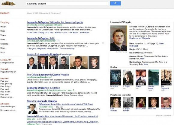 Όπως μπορείτε να διακρίνετε στην παραπάνω εικόνα, κάνοντας μια αναζήτηση του ονόματος 'Leonardo DiCaprio', στο δεξί μέρος της σελίδας εμφανίζονται πληροφορίες για το διάσημο ηθοποιό, όπως ένα σύντομο βιογραφικό, ταινίες στις οποίες έχει παίξει και οι δημοφιλέστερες σχετικές αναζητήσεις άλλων χρηστών. Το αριστερό τμήμα της σελίδας παραμένει ως έχει, εμφανίζοντας προτεινόμενες ιστοσελίδες που σχετίζονται με την αναζήτηση.