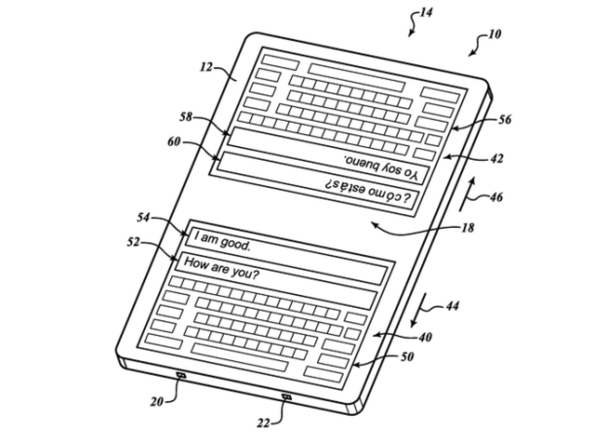 Πρόκειται για μια πατέντα της Google από το 2012, η οποία αφορά μια πολύ ενδιαφέρουσα εφαρμογή για smartphones που βασίζεται στην υπηρεσία Google Translate και ουσιαστικά παρέχει αυτόματη μετάφραση σε διάφορες γλώσσες. Εμφανίζονται δύο πληκτρολόγια αντιδιαμετρικά στη οθόνη και η λειτουργία είναι εξαιρετικά απλή. Ο ένας χρήστης γράφει στο ένα πληκτρολόγιο στη γλώσσα του και πατώντας αποστολή το μήνυμα φτάνει μεταφρασμένο στο δεύτερο πληκτρολόγιο για να το δει ο άλλος χρήστης.