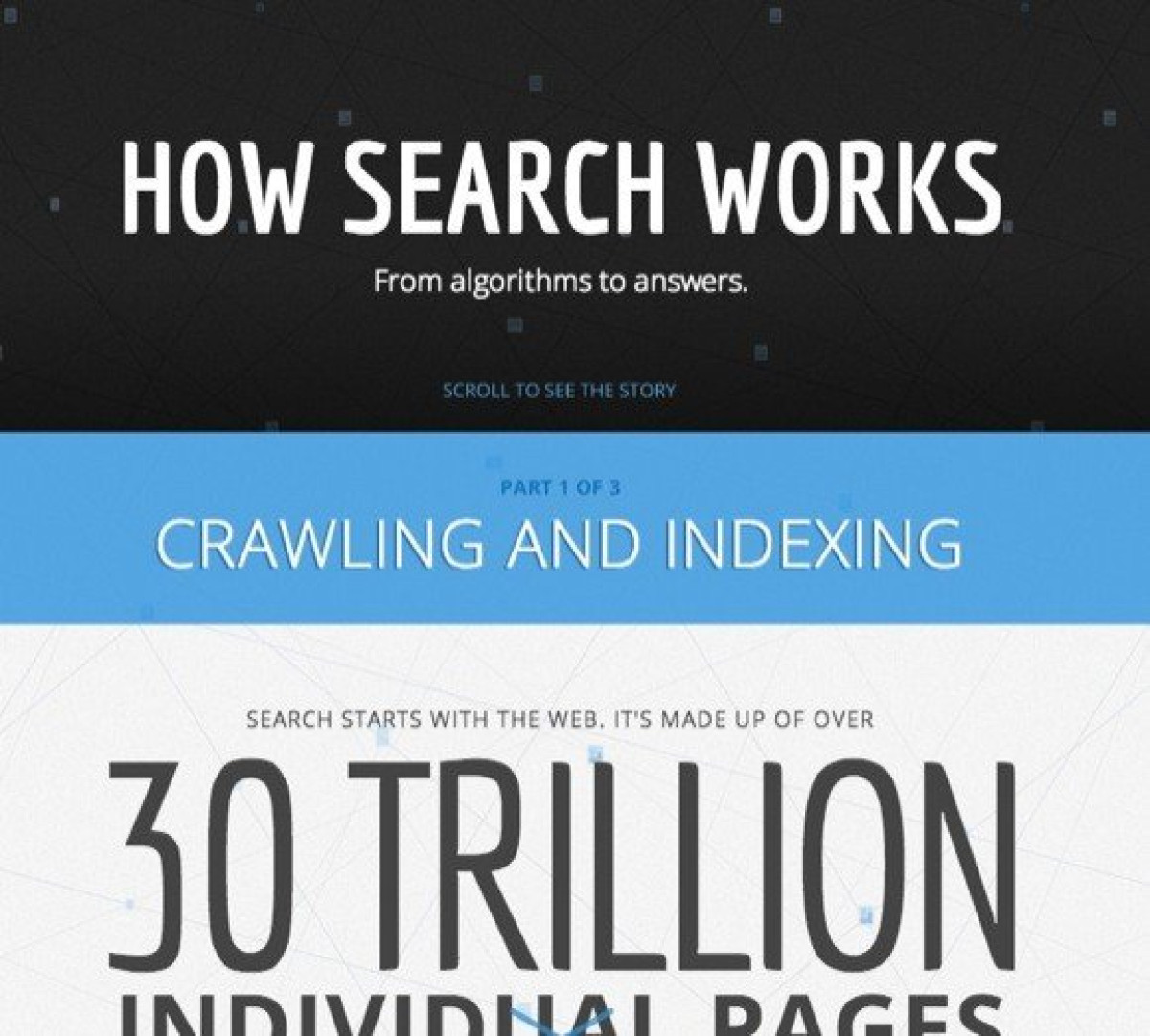 Μια εξαιρετικά ενδιαφέρουσα σελίδα δημιούργησε η Google με σκοπό να εξηγήσει με απλούς όρους πως λειτουργεί η αναζήτηση. Μην περιμένετε να μάθετε τον μυστικό αλγόριθμο που χρησιμοποιεί η εταιρεία αλλά ξέρατε για παράδειγμα ότι πραγματοποιούνται δισεκατομμύρια αναζητήσεις καθημερινά χάριν στην ανίχνευση και ευρετηρίαση πανω από 30 τρισεκατομμύρια σελίδες στο Internet;