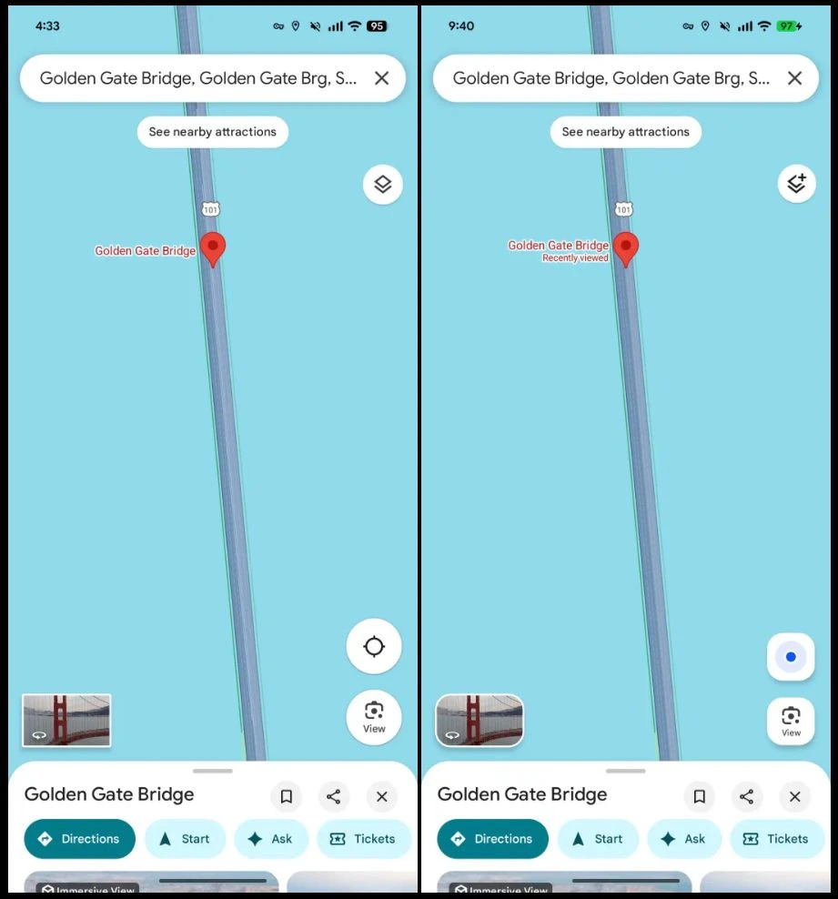 Πιο ψηλά στην οθόνη, βρίσκεται το layers button, που δίνει τη δυνατότητα στους χρήστες να αλλάξουν τον τύπο του χάρτη που βλέπουν: κλασική όψη, δορυφορική απεικόνιση ή χαρτογράφηση με έμφαση στην τοπογραφία. Το κουμπί αυτό έχει πλέον ένα μικρό επιπλέον στοιχείο: μια τελεία στο εσωτερικό του εικονιδίου. Πατώντας το, οι χρήστες μπορούν επίσης να ενεργοποιήσουν πληροφορίες για τα μέσα μαζικής μεταφοράς, την κίνηση σε πραγματικό χρόνο με χρωματική κωδικοποίηση, το οδικό δίκτυο για ποδήλατα ή ακόμα και την προβολή μέσω Street View.