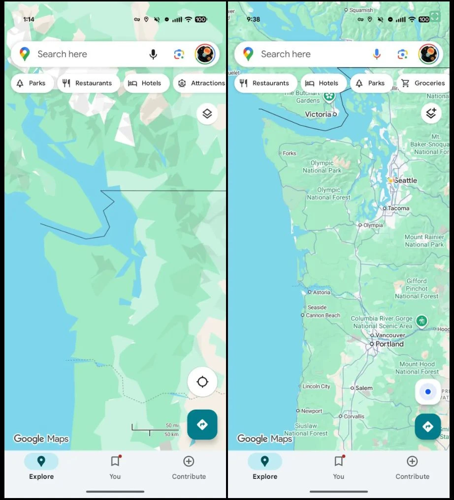 Μία ακόμη αλλαγή αφορά το κουμπί που δείχνει την τρέχουσα τοποθεσία σας. Μέχρι πρότινος, το εικονίδιο ήταν ένας μπλε κύκλος με ένα βέλος. Τώρα, έχει αποκτήσει νέο σχήμα —ένα squircle (κάτι μεταξύ τετραγώνου και κύκλου)— με εικονίδιο πυξίδας στο εσωτερικό του. Όταν ο χάρτης δεν δείχνει τη θέση σας, το εικονίδιο μετατρέπεται στο γνωστό μπλε στίγμα που υποδηλώνει το σημείο όπου βρίσκεστε.