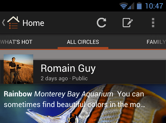 To Google+ για το Android αναβαθμίστηκε στην έκδοση 2.6 δανειζόμενη την νέα εμφάνιση που έκανε το ντεμπούτο της στην ομώνυμη εφαρμογή για το iOS προσφέροντας, βέβαια, και μερικές αποκλειστικές δυνατότητες. Για παράδειγμα, η εφαρμογή για το Android επιτρέπει την έναρξη Hangouts απευθείας από τη συσκευή σας, δυνατότητα που δεν υπήρχε στις προηγούμενες εκδόσεις. Μάλιστα, μπορείτε να επιλέξετε το Hangout αντί για τηλεφωνική ή Skype κλήση.