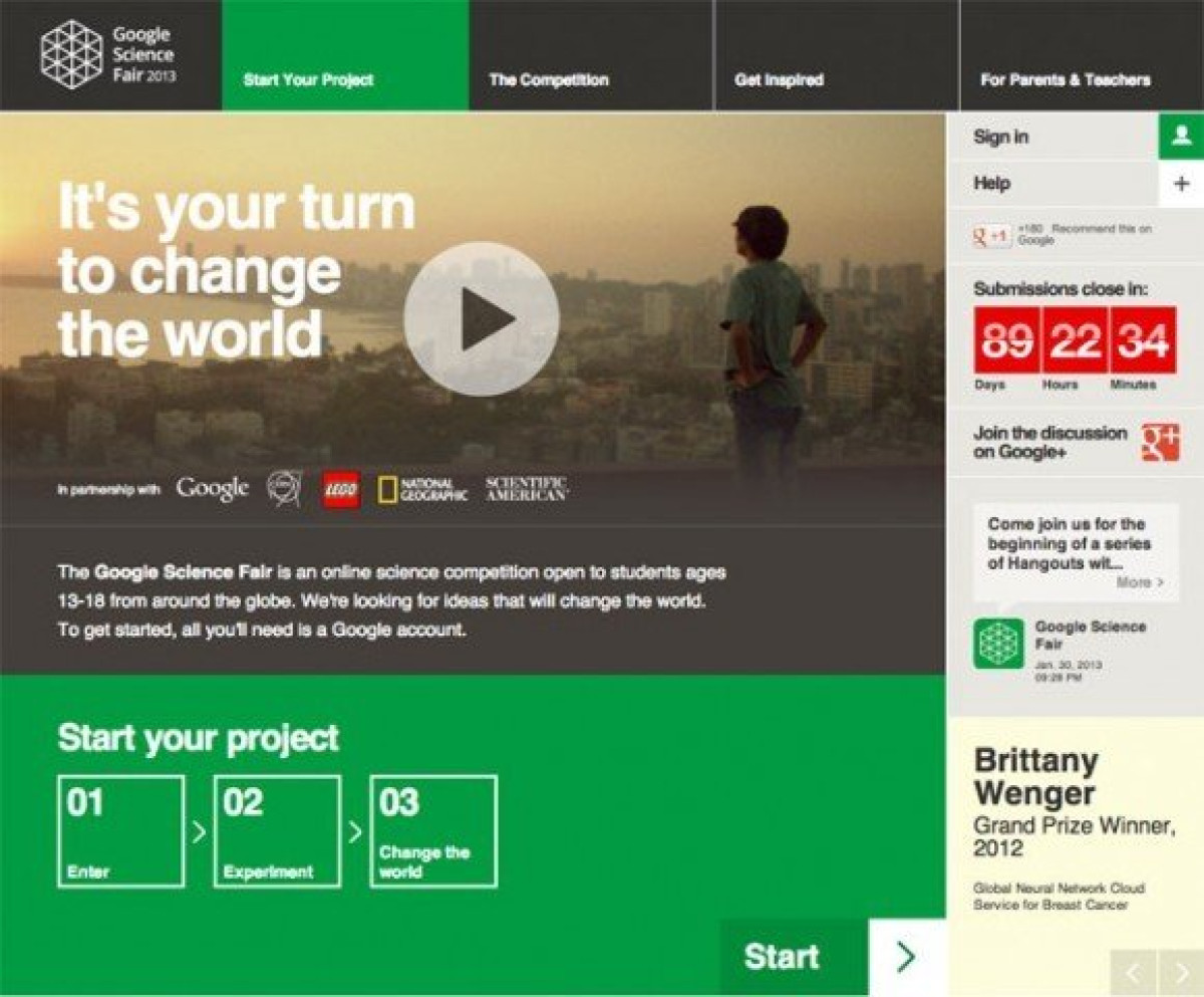 Φέτος για τρίτη συνεχή χρονιά ξεκίνησε ο online διαγωνισμός Google Science Fair, μέσω του οποίου η Google σε συνεργασία με τα CERN, LEGO Group, National Geographic και Scientific America αναζητούν την επόμενη γενιά επιστημόνων και μηχανικών.