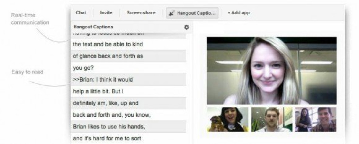Μια νέα εφαρμογή με την ονομασία Hangout Captions έρχεται να εμπλουτίσει τη δημοφιλή υπηρεσία βιντεοδιασκέψεων του Google+ με υπότιτλους, δίνοντας έτσι την ευκαιρία σε ανθρώπους που αντιμετωπίζουν προβλήματα ακοής να συμμετέχουν στις συνομιλίες.