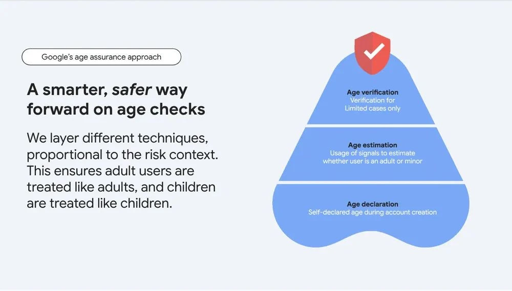 Αυτό το μοντέλο απεικονίζεται στην τριεπίπεδη πυραμίδα age assurance της Google. Στη βάση βρίσκεται η απλή ηλικιακή δήλωση. Στο δεύτερο επίπεδο, η εταιρεία αξιοποιεί μηχανική μάθηση για την εκτίμηση της ηλικίας, μια μέθοδο που βασίζεται σε ενδείξεις από τη δραστηριότητα του λογαριασμού. Μόνο στην κορυφή και σε περιορισμένες περιπτώσεις εφαρμόζονται οι κλασικές μέθοδοι πιστοποίησης, με χρήση ταυτότητας, selfie ή πιστωτικής κάρτας.