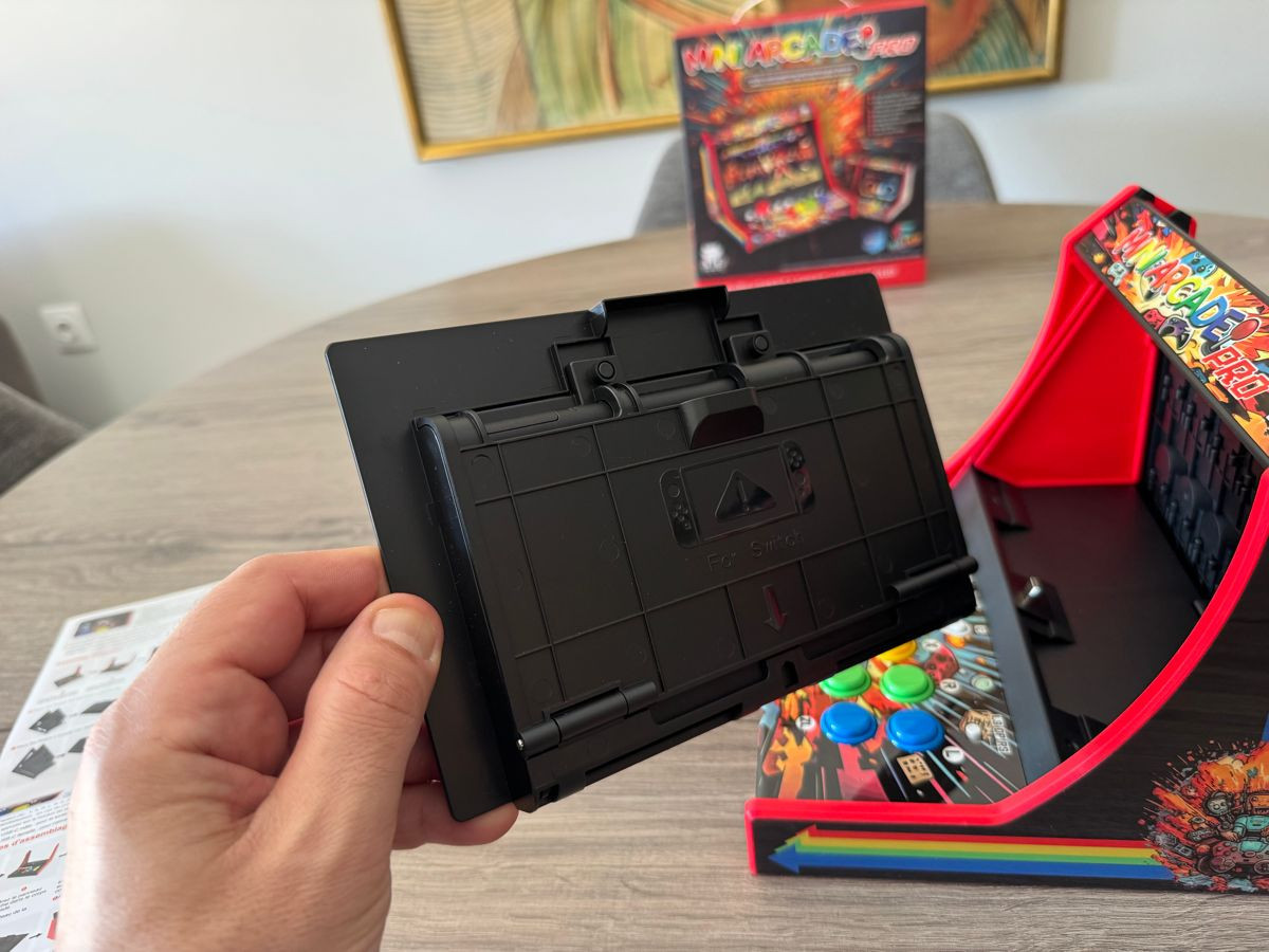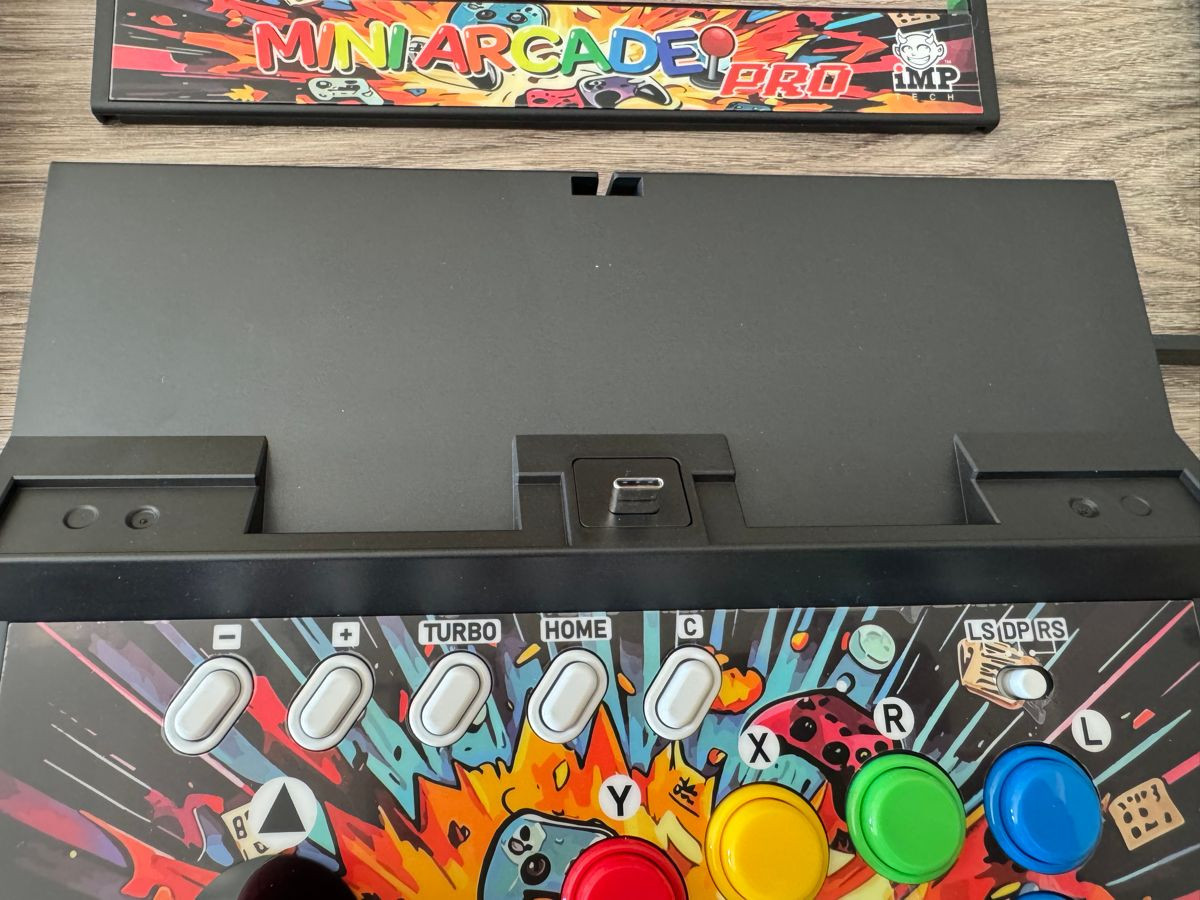 Ένα από τα μεγαλύτερα πλεονεκτήματα του iMP Mini Arcade Pro είναι η δυνατότητα pass-through charging. Στο πίσω μέρος υπάρχει θύρα εισόδου USB-C, που επιτρέπει την ταυτόχρονη φόρτιση της κονσόλας όσο παίζεις. Αυτό λύνει το μεγαλύτερο πρόβλημα του handheld gaming: την αυτονομία μπαταρίας. Μπορείς να έχεις το setup μόνιμα στο γραφείο σου, συνδεδεμένο στο ρεύμα, λειτουργώντας ως ένας μίνι σταθμός ψυχαγωγίας.