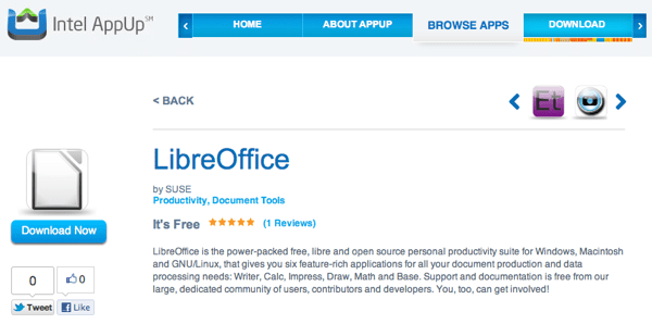Η ειδική έκδοση του LibreOffice που διατίθεται μέσα από το κατάστημα Intel AppUp Center έχει δημιουργηθεί από τη SUSE, υποστηρίζει 5 διαφορετικές γλώσσες (Αγγλικά, Γαλλικά, Γερμανικά, Ιταλικά, Ισπανικά), υπόσχεται εύκολη και γρήγορη εγκατάσταση/απεγκατάσταση σε υπολογιστές Windows PC και περιλαμβάνει προγράμματα για την επεξεργασία κειμένου, τη δημιουργία παρουσιάσεων κλπ.