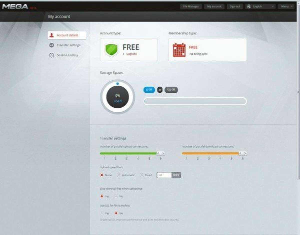 Όπως μπορείτε να δείτε, ο χρήστης θα μπορεί να ρυθμίσει την ταχύτητα upload, να απενεργοποιήσει τη λειτουργία SSL κατά τη μεταφορά δεδομένων για βελτίωση της απόδοσης χωρίς να μειώνεται η ασφάλεια και να έχει ανοικτές μέχρι 6 παράλληλες συνδέσεις για upload και άλλες τόσες για download.