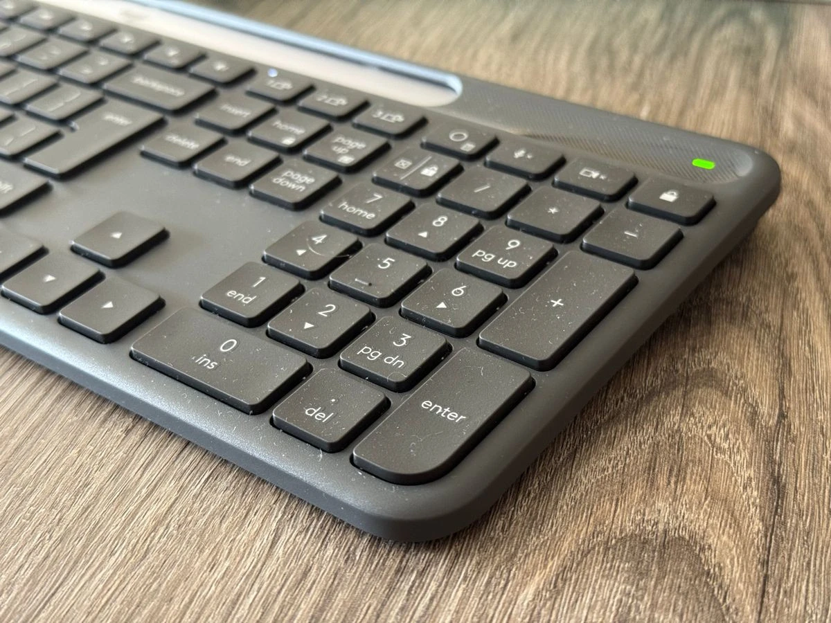 Η ποιότητα κατασκευής είναι στιβαρή, χωρίς τριγμούς ή αίσθηση φθηνού πλαστικού, παρά το ελαφρύ του βάρος. Ιδιαίτερη μνεία πρέπει να γίνει στην οικολογική συνείδηση της εταιρείας, καθώς τα πλαστικά μέρη της έκδοσης σε χρώμα γραφίτη περιέχουν 70% πιστοποιημένο ανακυκλωμένο πλαστικό, μια κίνηση που δείχνει τη δέσμευση της Logitech στη βιωσιμότητα. Το πλήρες layout, με το αριθμητικό πληκτρολόγιο (numpad) στα δεξιά, είναι ένα τεράστιο πλεονέκτημα για επαγγελματίες που εργάζονται με αριθμούς και spreadsheets, προσφέροντας πλήρη λειτουργικότητα χωρίς συμβιβασμούς στο μέγεθος. Το κυρίαρχο στοιχείο, ωστόσο, παραμένει η διακριτική, γυαλιστερή λωρίδα στο πάνω μέρος, η οποία δεν είναι απλώς ένα διακοσμητικό στοιχείο, αλλά η καρδιά ολόκληρης της συσκευής.