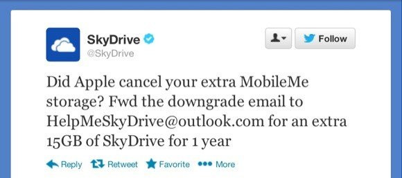 Μια έξυπνη προωθητική κίνηση της Microsoft στοχεύει τους χρήστες Apple συσκευών και ειδικότερα εκείνα τα πρώην μέλη του MobileMe - η αποτυχημένη προσπάθεια της Apple στις cloud υπηρεσίες - που δικαιούνταν 20GB δωρεάν αποθηκευτικού χώρου στο iCloud για περίπου έναν χρόνο.