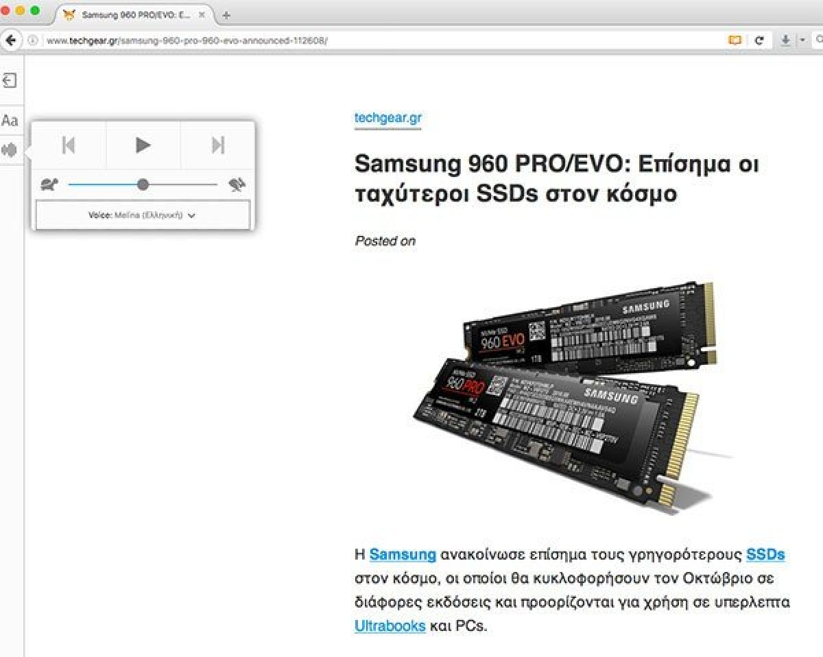 Η πρώτη έχει να κάνει με το πολύ βελτιωμένο Reader Mode. Ανοίξτε ένα οποιοδήποτε άρθρο που σας ενδιαφέρει και αν υποστηρίζει το Reader Mode (η πλειοψηφία) θα δείτε στην δεξιά πλευρά της address bar το εικονίδιο του βιβλίου. Αυτό δεν είναι κάτι καινούργιο (υπάρχει από το 2012), ωστόσο, η Mozilla πρόσθεσε ένα mode αφήγησης με σημαντικά βελτιωμένη απόδοση και υπόστηριξη πολλών γλωσσών, συμπεριλαμβανόμενης της Ελληνικής. Επίσης, έχουν προστεθεί επιλογές για γραμματοσειρά (τύπος/μέγεθος) και διαφοροποίηση του theme ανάλογα με το φως της ημέρας για πιο ξεκούραστη ανάγνωση.
