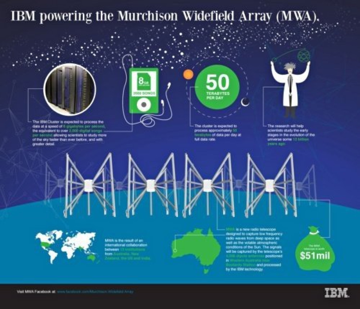 "Το project MWA βασίζεται στην απίστευτη υπολογιστική δύναμη που προσφέρει το iDataPlex της IBM για να δημιουργεί ευρείες εικόνες από ραδιοφωνικά κύματα σε πραγματικό χρόνο. Ο συνδυασμός του MWA, της τεχνολογίας από την ΙΒΜ και του κενού (από ραδιοφωνικά κύματα) περιβάλλοντος του Murchison θα μας επιτρέψει να αναζητήσουμε εξαιρετικά ασθενή σήματα που προέρχονται από τα πρώτα στάδια εξέλιξης του Σύμπαντος, περίπου πριν από 13 δισ. χρόνια"