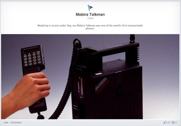 Η Nokia εκμεταλλεύεται και αυτή με τη σειρά της το νέο Facebook Timeline ανανεώνοντας τη σελίδα της με νέες πληροφορίες που φτάνουν μέχρι και το 1865, τότε που η εταιρεία δεν υπήρχε καν στον χάρτη. Παρόλο που δεν υπάρχουν όλες οι λεπτομέρειες της ιστορίας της Nokia θα βρείτε ορισμένα ενδιαφέροντα γεγονότα και προϊόντα που έχουν αποδειχθεί σημαντικά για την μετέπειτα εξέλιξη της εταιρείας.