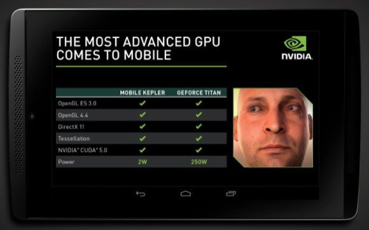 H Nvidia απεκάλυψε τον νέο επεξεργαστή γραφικών για φορητές συσκευές που βασίζεται στην ίδια αρχιτεκτονική Kepler με τις τελευταίες κάρτες γραφικών της εταιρείας για PC. To chip, με την κωδική ονομασία Logan, υποστηρίζει το Unreal Engine 4 και τα πρότυπα Open GL 4.4 και Dirext X 11 χρησιμοποιώντας το ένα τρίτο της κατανάλωσης σε GPUs που βρίσκονται σε tablets όπως το iPad.