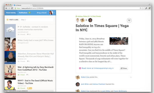 Το νέο social network ονομάζεται Potluck και αποτελεί ένα χώρο όπου ο μέσος χρήστης μπορεί να ανταλλάσσει ενδιαφέροντα links με τους φίλους του. Στο Potluck θα βρείς ένα stream από links σε άρθρα, video, μουσική και φωτογραφίες από τους φίλους σου δίχως όμως να μπορείς να δεις ποιος έχει δημοσιεύσει τι εάν δεν πατήσεις πάνω στο link.
