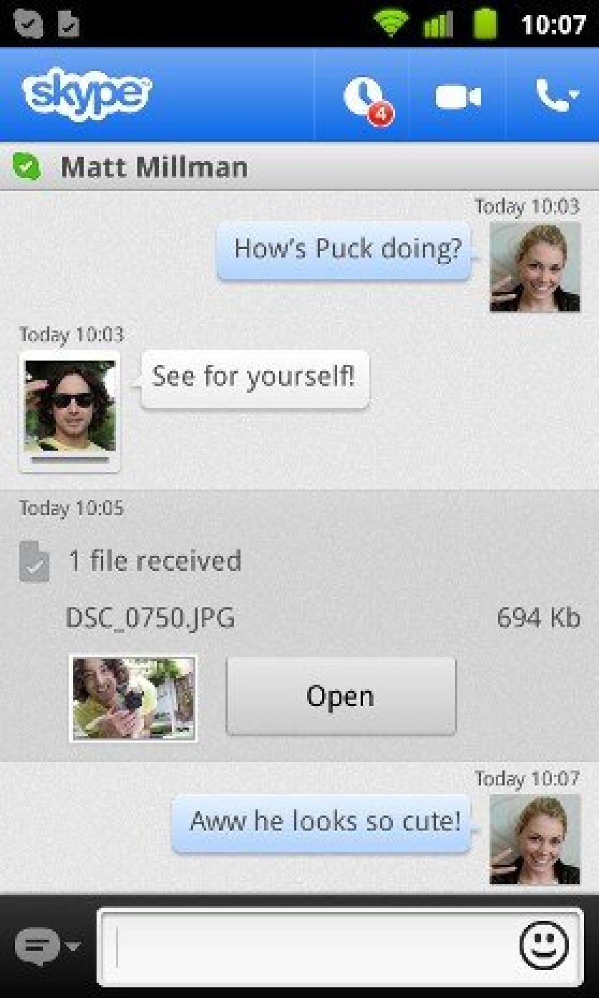 Η νέα έκδοση της εφαρμογής Skype για Android (2.6) μόλις κυκλοφόρησε και μαζί της φέρνει υποστήριξη για αποστολή φωτογραφιών, video ή και άλλων αρχείων απευθείας από τις Android συσκευές μέσω WiFi ή 3G.