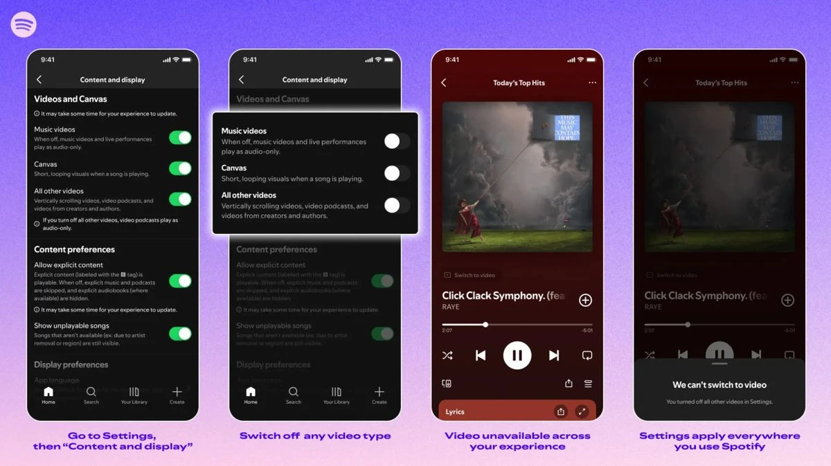 - Οι νέες ρυθμίσεις καλύπτουν τα Canvas (τα σύντομα βίντεο λούπας), τα επίσημα μουσικά βίντεο και τα video podcasts.