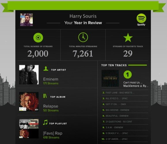 Το ωραίο με το εγχείρημα της Spotify είναι ότι μπορείτε να δημιουργήσετε και τη δική σας προσωποποιημένη σελίδα που σας παρουσιάζει τα τραγούδια που έχετε ακούσει περισσότερα, τα λεπτά που έχετε αφιερώσει κτλπ, όπως βλέπετε στην παραπάνω φωτογραφία (χωρίς σχόλια...).