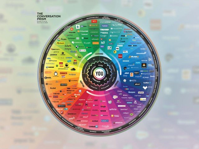 Το αποτέλεσμα είναι με τόσα πολλά ονόματα πολλές φορές να δυσκολευόμαστε να θυμηθούμε ποια κάνει τι, κάτι στο οποίο έρχεται να βοηθήσει η πρωτοβουλία των Brian Solis και JESS3, The Conversation Prism. Πρόκειται για ένα πολύχρωμο Infographic που παρουσιάζει τα κορυφαία social media του Διαδικτύου ομαδοποιημένα σε κατηγορίες. Click για Full Size:
