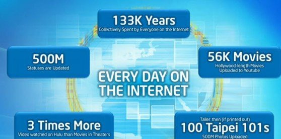 Σύμφωνα με τα όσα είπε, περισσότεροι από 500 εκατ. χρήστες αλλάζουν καθημερινά status στα social networks και πραγματοποιούνται περίπου 500 εκατ. uploads φωτογραφιών. Στο YouTube ανεβαίνει περιεχόμενο διάρκειας ίσης περίπου με 56.000 τανίες, ενώ στο Hulu παρακολουθείται περισσότερο video από ό,τι ταινίες στους κινηματογράφους. Τέλος ο συνολικός χρόνος που έχουν περάσει στο Διαδίκτυο όλοι οι χρήστες του αντιστοιχεί σε 133.000 χρόνια!
