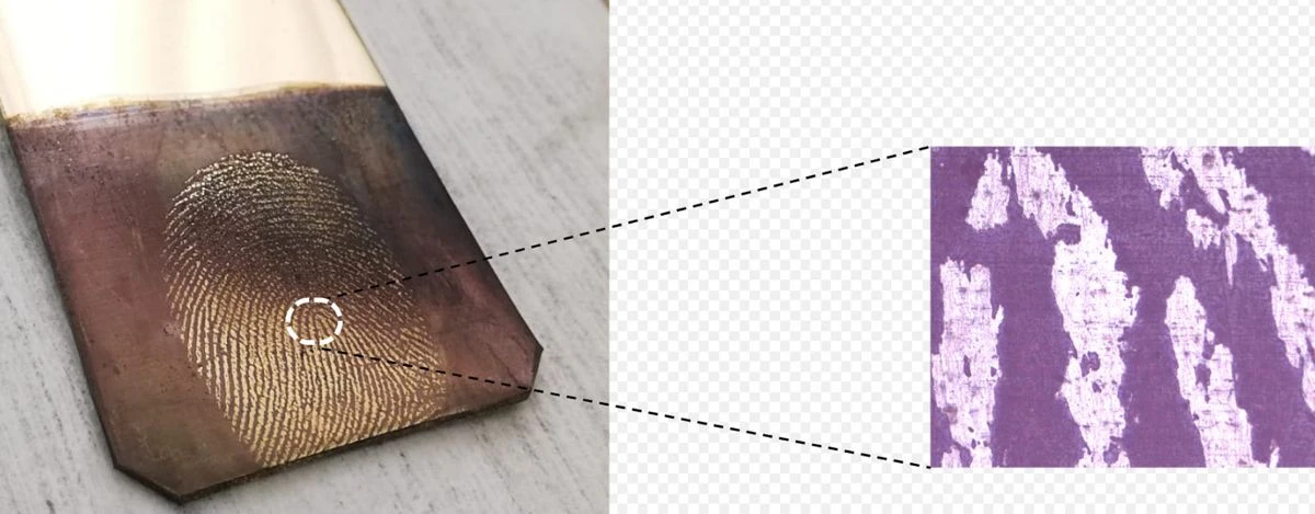 Η τεχνική τους βασίζεται σε έναν συνδυασμό χημείας και ηλεκτροχημείας. Με τη χρήση ενός ειδικού χημικού διαλύματος και ελεγχόμενης εφαρμογής ηλεκτρικού ρεύματος, οι ερευνητές κατάφεραν να «αναδείξουν» υπολείμματα από την επιφάνεια του μετάλλου. Αυτά τα υπολείμματα, όπως αποδείχθηκε, δεν εξαφανίζονται τελείως με τη θερμότητα, αλλά παραμένουν, όπως η αόρατη μελάνη, κρυμμένα μέσα στο μικροσκοπικό καμένο στρώμα του μετάλλου.