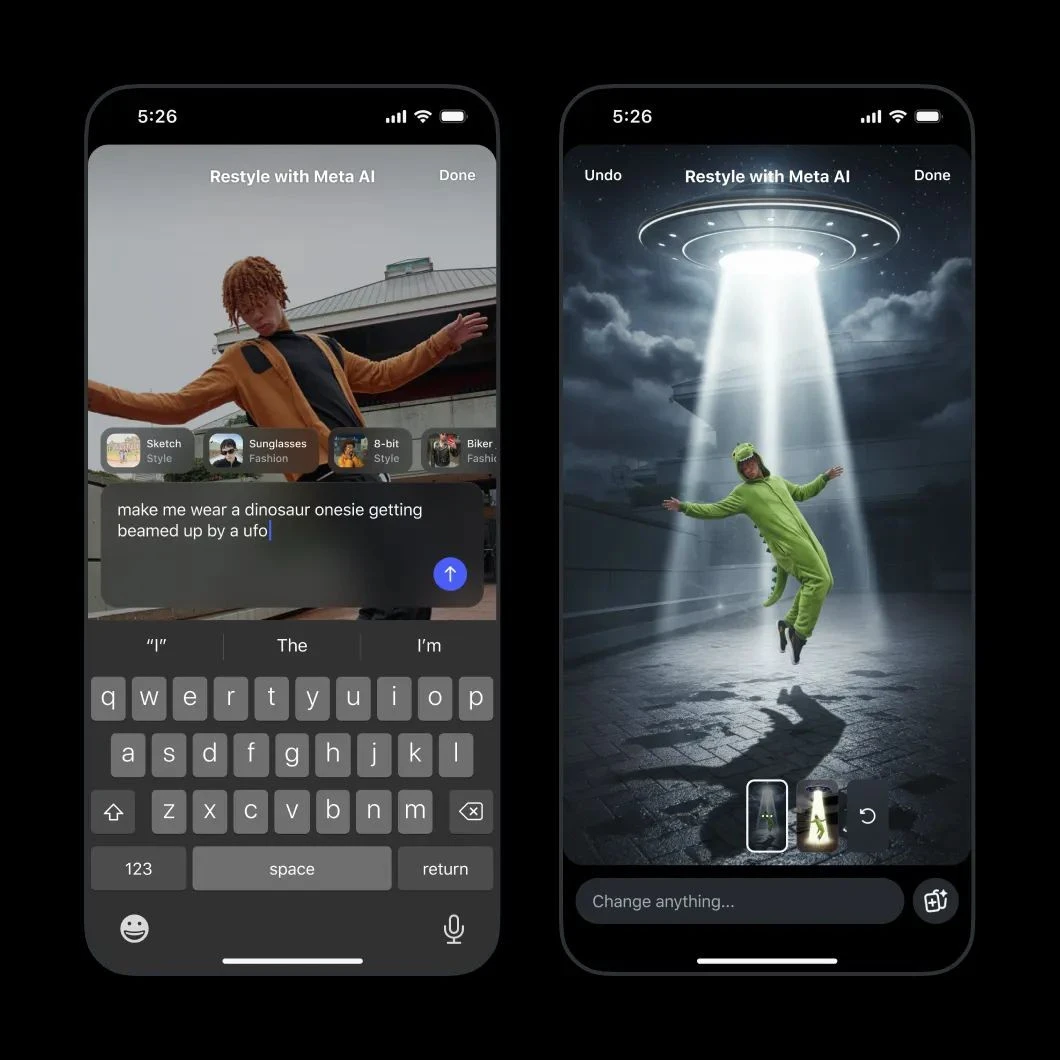 Η λειτουργία Restyle ξεκίνησε αρχικά ως ένα εργαλείο επεξεργασίας φωτογραφιών, επιτρέποντας, για παράδειγμα, την αφαίρεση ανεπιθύμητων λεπτομερειών — όπως ένας photobomber στο φόντο ή ένα τυχαίο δάχτυλο που μπήκε στο κάδρο. Παράλληλα, οι χρήστες μπορούν να προσθέτουν νέα στοιχεία ή να αλλάζουν συγκεκριμένα χαρακτηριστικά, όπως το χρώμα των μαλλιών κάποιου ή τον ουρανό στο φόντο. Τώρα όμως, η Meta επεκτείνει σημαντικά τη λειτουργικότητα αυτής της τεχνολογίας, φέρνοντας δύο νέες κατηγορίες εργαλείων: Restyle Text και Restyle Video.