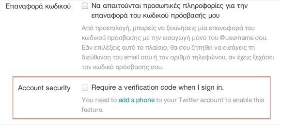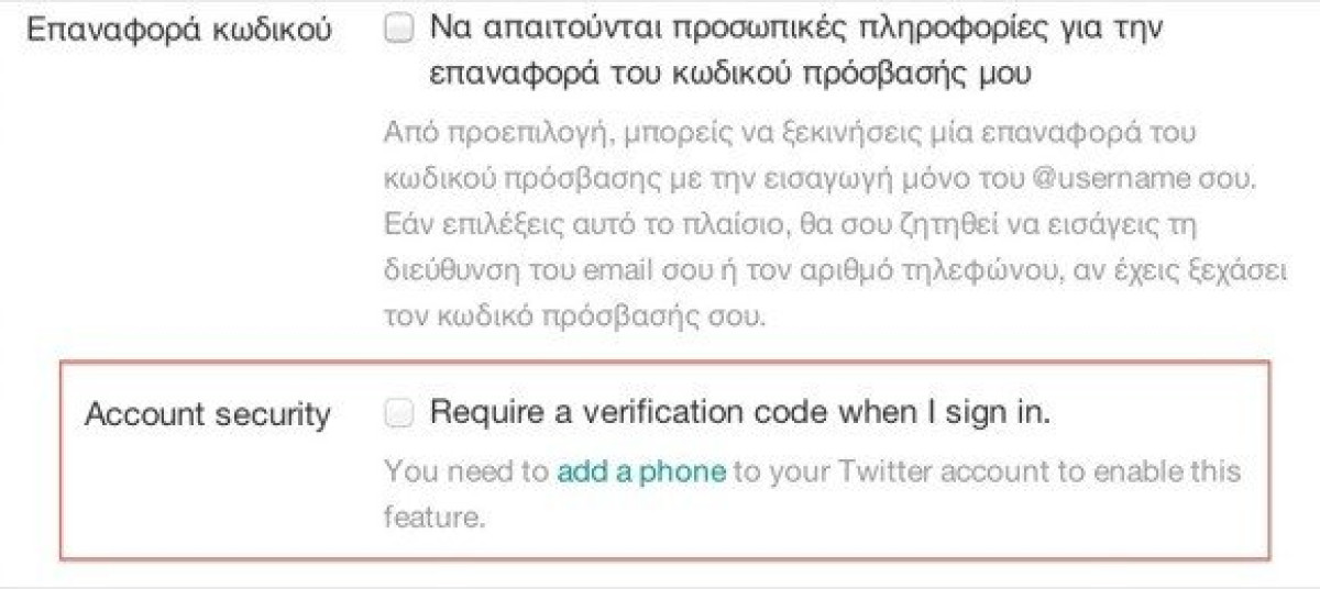 Για να ενεργοποιήσετε την επιλογή αυτή επισκεφτείτε τις Ρυθμίσεις του λογαριασμού σας στο Twitter.com και επιλέξτε την επιλογή 'Require a verification code when I sign in'. Θα πρέπει να προσθέσετε τον αριθμό του κινητού σας τηλεφώνου και κάθε φορά που θα κάνετε login θα σας αποστέλλεται ένας 6-ψήφιος κωδικός που θα πρέπει να πληκτρολογήσετε στην ιστοσελίδα.