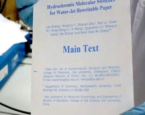 Κινέζοι επιστήμονες έκαναν ένα πολύ σημαντικό βήμα για την αντιμετώπιση της ενεργειακής κρίσης του πλανήτη και του φαινομένου του θερμοκηπίου που προέρχεται από την αλόγιστη χρήση χαρτιού και την αποψίλωση των δασών. Δημιούργησαν ένα νέο σύστημα εκτύπωσης χρησιμοποιώντας νερό αντί για μελάνι σε ένα ειδικό χαρτί που αλλάζει χρώμα όταν βρέχεται!