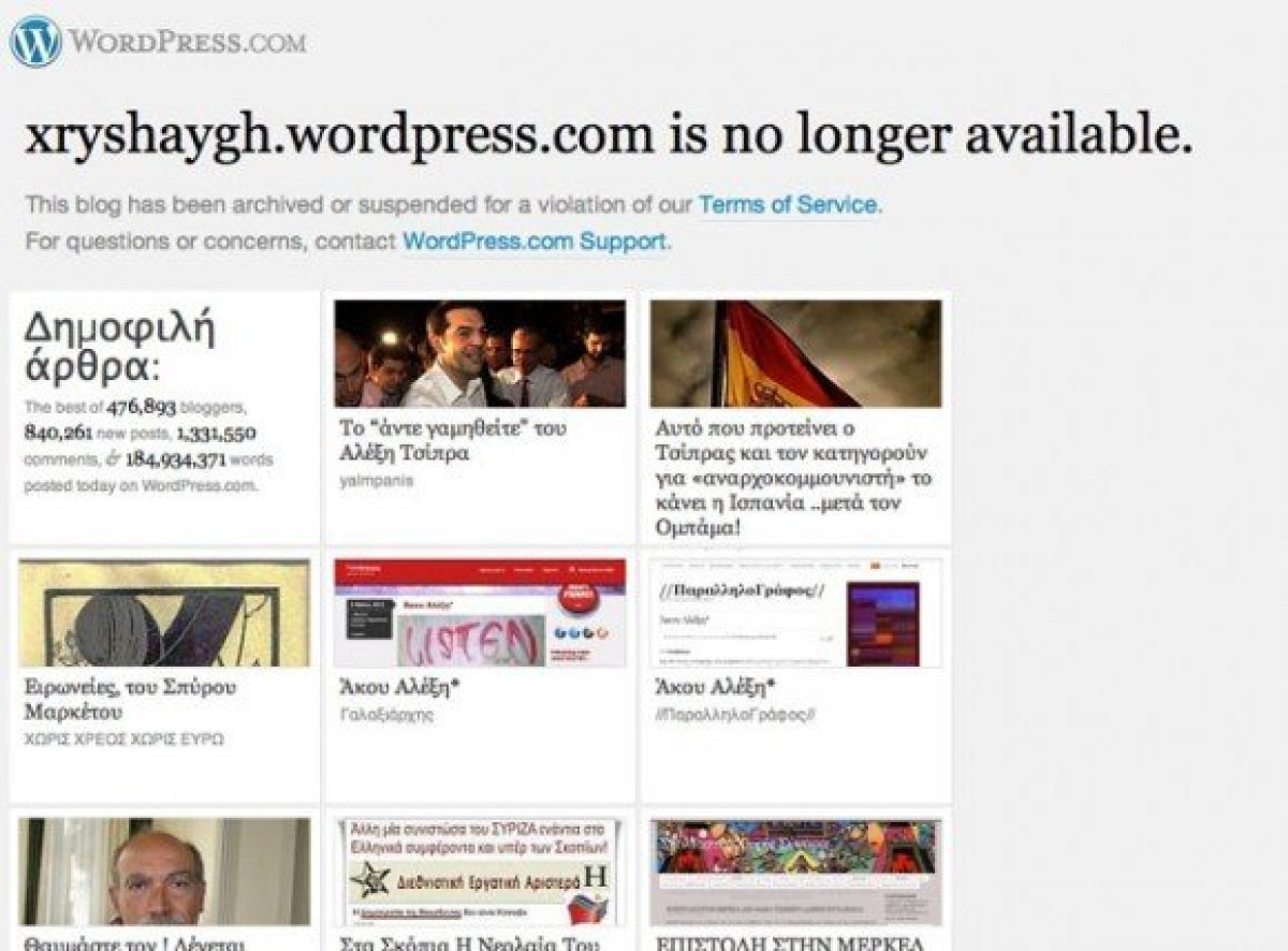 Πριν από λίγη ώρα, η WordPress κατέβασε την ιστοσελίδα της Χρυσής Αυγής, με τη δικαιολογία ότι παραβιάζει τους όρους χρήσης της πλατφόρμας. Η δημοφιλής πλατφόρμα που στεγάζει εκατομμύρια blogs από όλο τον κόσμο, έχει κάθε δικαίωμα να προβεί σε τέτοιες ενέργειες εάν και εφόσον κρίνει ότι είναι απαραίτητο.