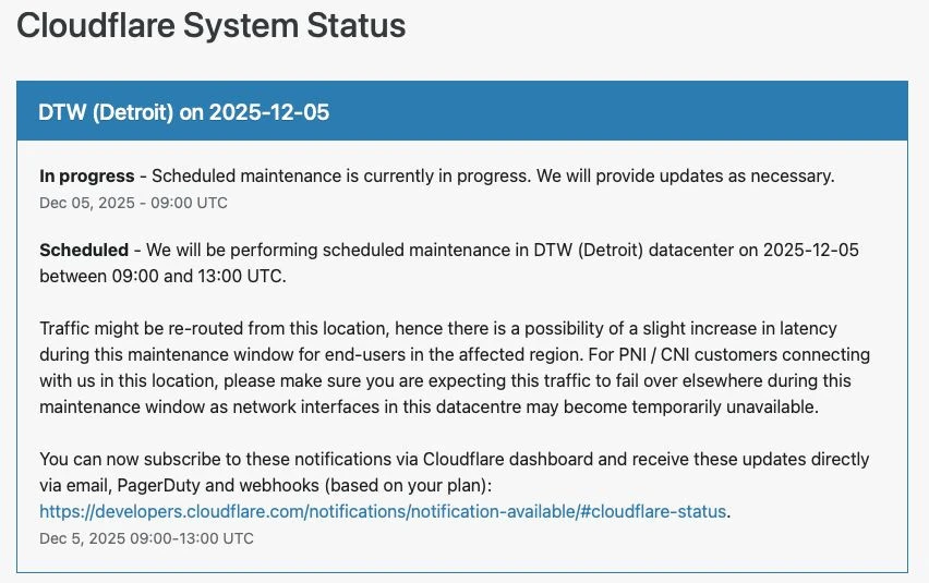 Στην επίσημη ιστοσελίδα της Cloudflare υπάρχει ανακοίνωση για προγραμματισμένη συντήρηση στο data center της στο Detroit, αλλά πέραν τούτου δεν βλέπουμε κάποια ενημέρωση για τα νέα προβλήματα.