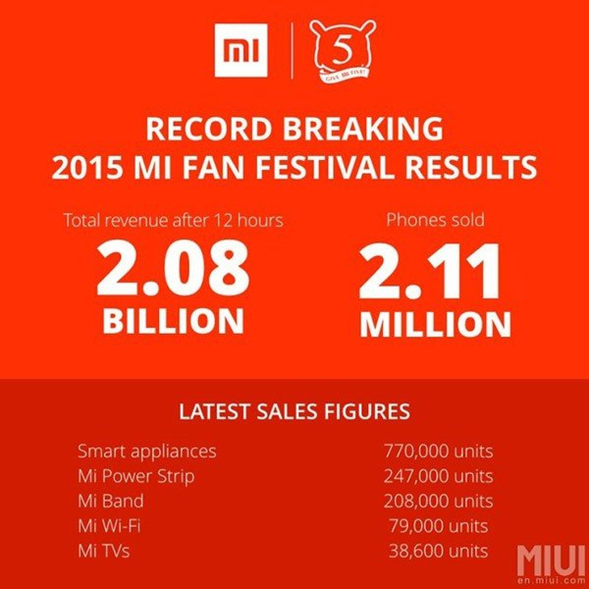 Στην Ελλάδα σφάζαμε αμνοερίφια για το Πάσχα και στην Κίνα η Xiaomi "έσφαζε" smartphones με αφορμή τα 5ά γενέθλια της. Το αποτέλεσμα; Εμείς σκάσαμε από το φαγητό και εκείνοι από τα ρεκόρ και το χρήμα, αφού μέσα σε 12 ώρες πούλησαν 2.12 εκατομμύρια smartphones και κατέγραψαν τζίρο περίπου €320 εκατ. Σε αυτά προσθέστε 38.000 Mi TVs, 200.000 Mi Bands και 247.000 Mi Power Strips που απέφεραν επίσης τζίρο περίπου €30 εκατ.