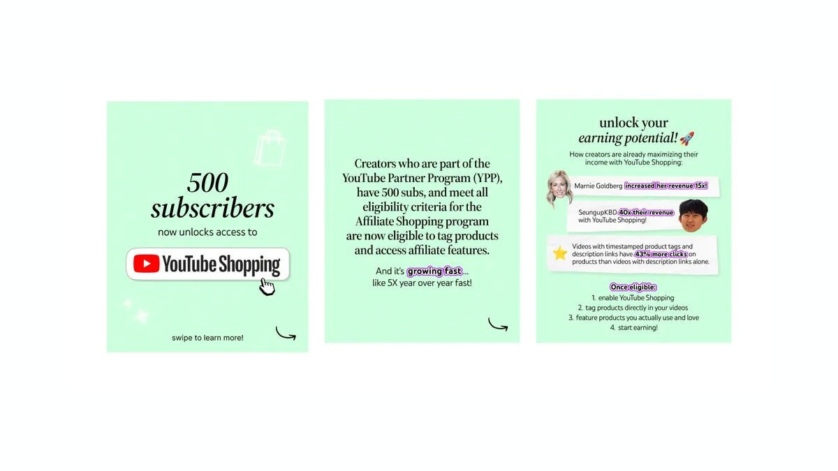 Το YouTube επεκτείνει το πρόγραμμα συνεργατών (Affiliate Shopping), επιτρέποντας σε κανάλια με τουλάχιστον 500 συνδρομητές να κερδίζουν προμήθειες. Απαιτούνται επιπλέον 3.000 ώρες παρακολούθησης ή 3 εκατομμύρια προβολές σε Shorts. Οι δημιουργοί μπορούν πλέον να ενσωματώνουν ετικέτες αγοράς (product tags) απευθείας σε Videos, Shorts και ζωντανές μεταδόσεις.